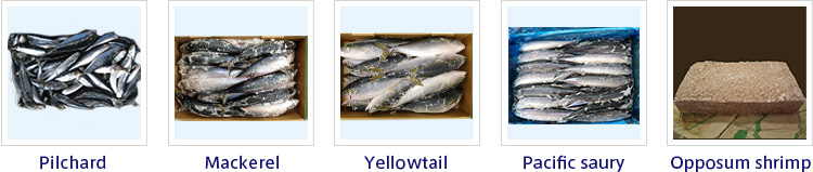 - ● Japanese sardine, Japanese anchovy, Round herring, Mackerel, Horse mackerel, Amberstripe scad, Pacific saury, Yellowtail, Japanese common squid, Frigate mackerel, Spanish mackerel, Gizzard shad, Leather fish, sand lance, krill and other marine products.