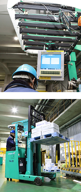 商品を運ぶフォークリフトには移動端末を設置しています。